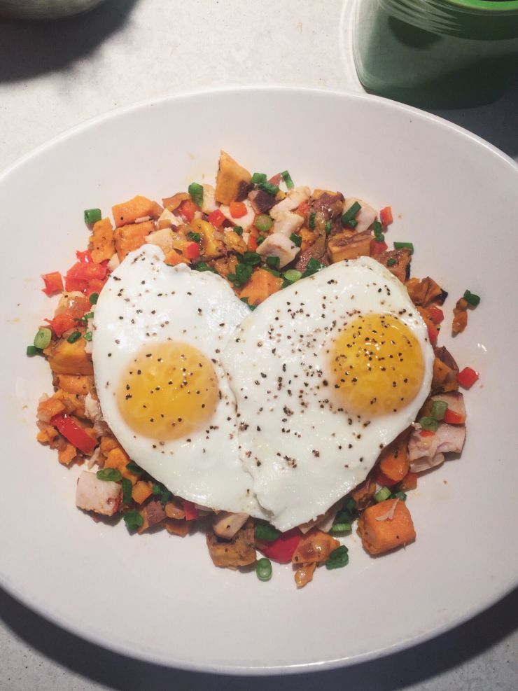 For the love of Eggs... On a bed of Sweet Potatoes, chunks of Tuna, dices red Bell Sweet Peppers, chopped Spring Onions, Cress, chopped Chives  and Black Pepper.